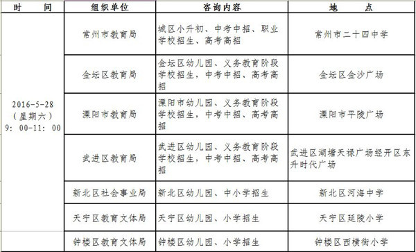 2016年常州市幼儿园、中小学招生政策现场咨询活动安排表