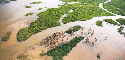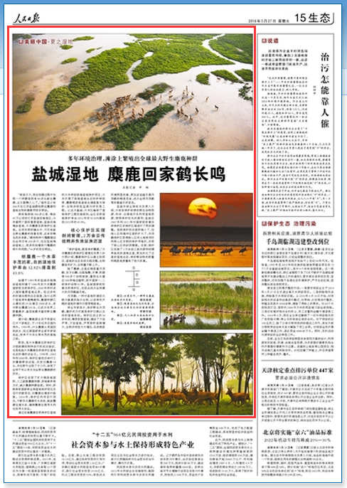 始建于1983年的盐城沿海滩涂湿地和建于1986年的大丰麋鹿国家级自然保护区,2002年同时进入国际重要湿地名录。经过多年的环境治理和生态修复,如今这两个湿地常年鹤舞鹿鸣,麋鹿种群已从最初的39头增至2800多头,其中野生麋鹿265头,已成为世界上数量最多、基因库最丰富的野生麋鹿种群。