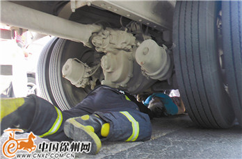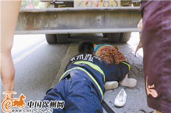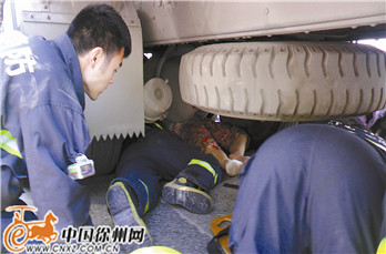 中国徐州网-彭城晚报新闻热线85608110消息 (记者 李梦琪) 昨日上午10:10左右,白云山地下道东侧,一辆货车将一名70岁左右的老太卷进车底。后方公交车司机看到后,立刻下车告知货车司机,让他停车。消防员和120救护人员赶到现场后,发现营救空间狭小。两名消防员钻进车底,固定住老太身体,另外5名消防员和鼓楼交警大队交警以及30多位热心市民一起推车,将老太从车底救出。随后,老太被送往医院救治。医生表示,老太四肢擦伤,其他检查结果还没出来,但受到惊吓,意识不太清醒。