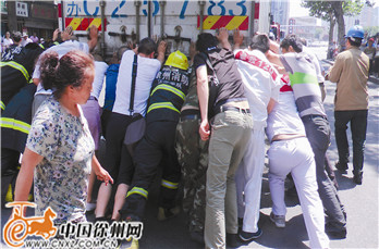 众人合力推车救人