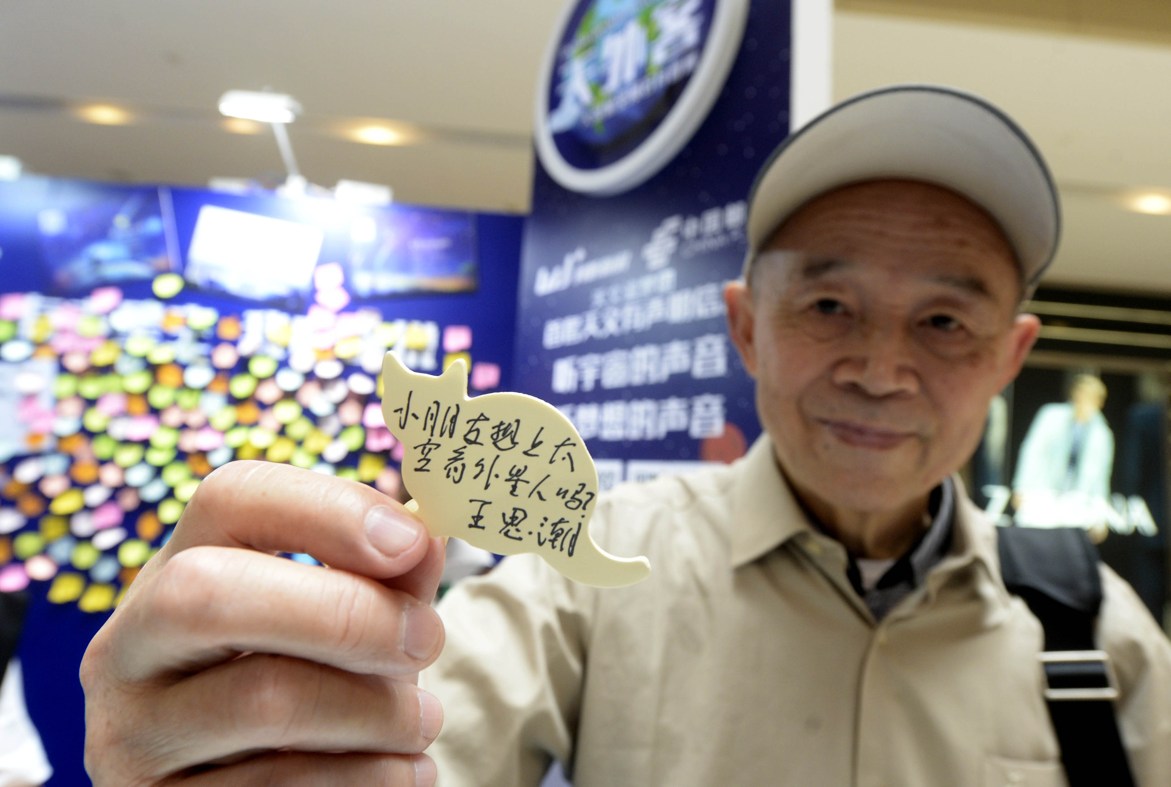 在展览现场,老先生最赞赏的一个环节是 " 宇宙提问墙 ",墙上贴满了孩子们的各种宇宙提问,老先生花了 40 分钟的时间把每一个孩子的问题都看了一遍,还笑着赞赏孩子们的好奇心和创造力。
