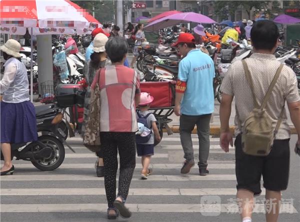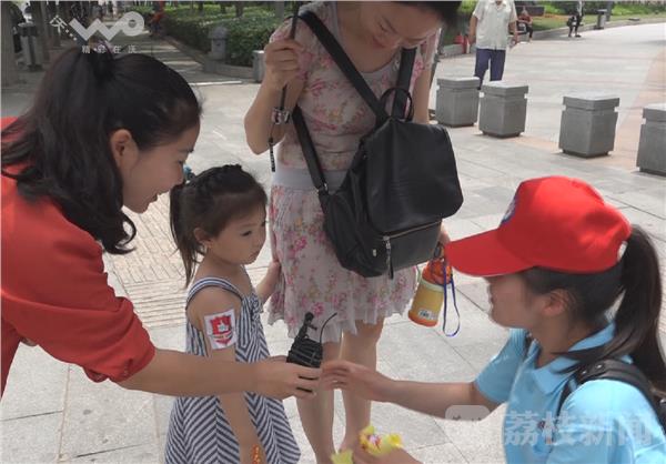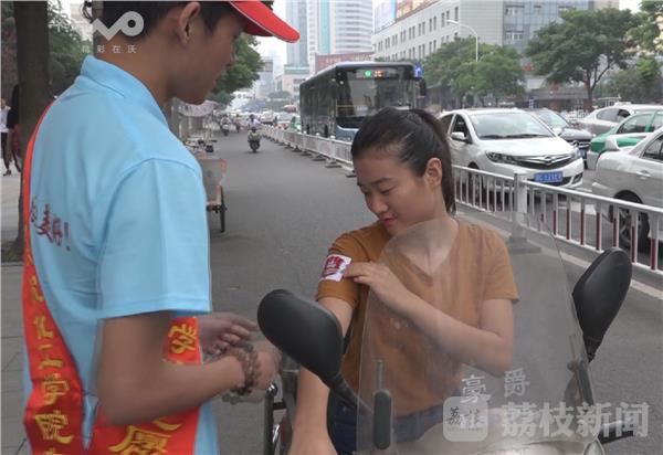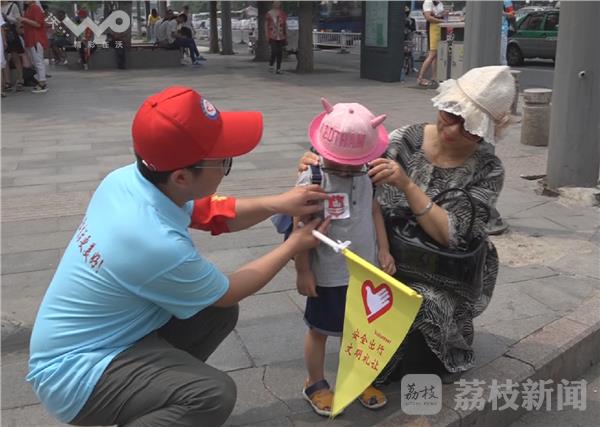 7月5日中午,在徐州市中心彭城广场附近,有一群身穿蓝色T恤的大学生志愿者,他们手拿小黄旗站在炎热的太阳下为文明的路人点赞。