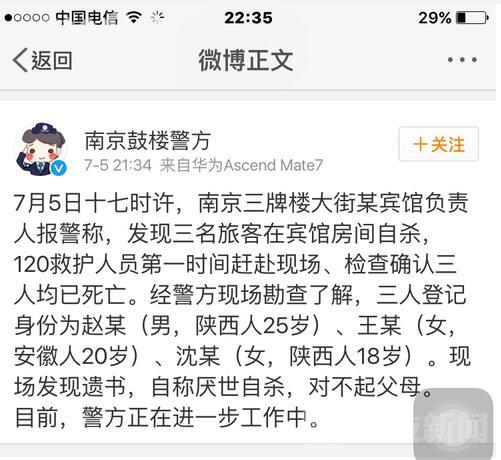 7月5日晚9点34分,南京鼓楼警方通过官方微博,通报了一起案情。当天下午5时许,南京三牌楼大街某宾馆负责人报警称,发现三名旅客在宾馆房间自杀,120救护人员第一时间赶到现场、检查确认三人均已死亡。