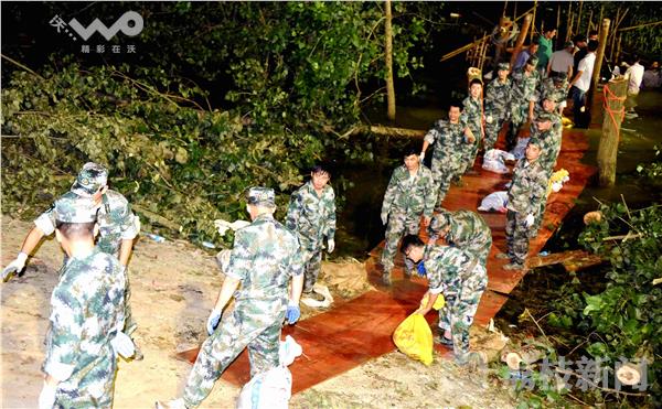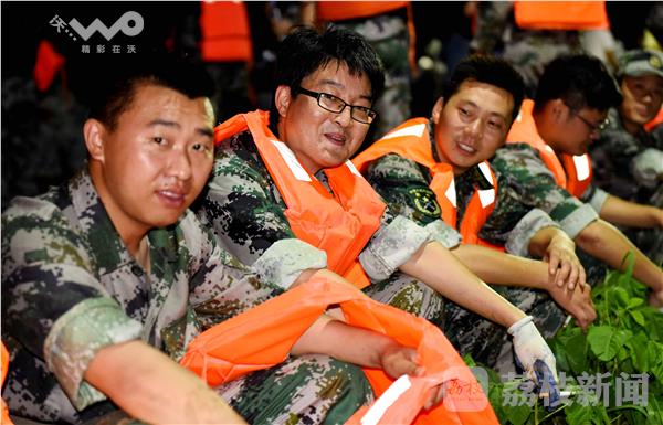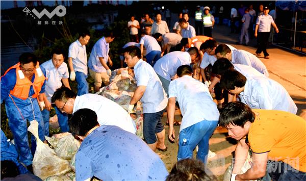 2016年7月8日17时,仪征市十二圩办事处的江堤上,500多名军民正在将冒着江水的渗漏点,筑成围堰,防止江水入浸。