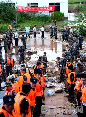 连日来,长江水位一直保持高水位,长江仪征段江堤多点出现渗漏现象。当地党委和政府高度重视,除了组织沿江村民和水利专家实施24小时不间断巡查外,对险工患段进行重点盯防,对出现渗漏的地段,组织村民和民兵进行封堵。8日下午,巡查人员发现江堤出现渗漏情况严重上报后,市防汛抗旱指挥部下达抢险救灾指令,仪征市人武部闻警而动,迅速调集120多名民兵应急队员带着防汛工具,参加抗洪救灾行动。目前, 500多名军地抢险人员,正在长江仪征段江堤严防死守,确保长江大堤安全度汛。