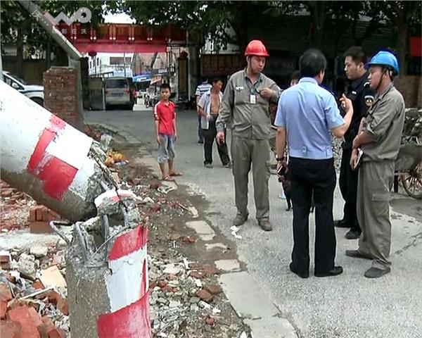 那么,这两根水泥圆杆到底是怎么倒下来的呢?昨天(7月8日)下午,民警调看了监控,清楚地看到是工地上的挖掘机作业不慎拉倒了两根水泥圆杆。民警将工地负责人朱某叫到派出所,在看完监控后,朱某称当时自己并没有在现场,所以对当时的情况不知情。他表示既然是挖掘机带倒了水泥圆杆,他们愿意赔偿一切损失。目前,抢修工作正在进行之中。