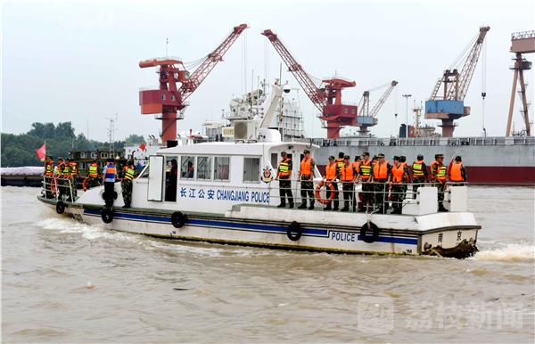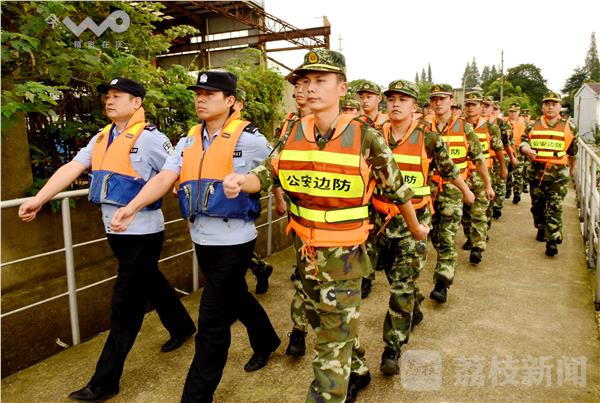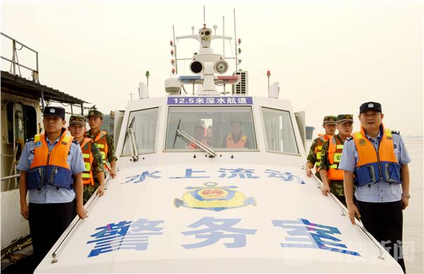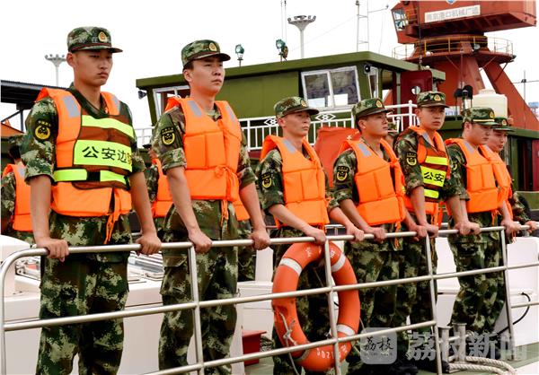 2016年7月9日,长江江苏省仪征市紫金山船厂码头的江面上,武警扬州边防站仪征监护二中队的官兵,正会同长航南京公安仪征派出所的干警以及企业民兵一道,巡视长江岸边防台风措施,对停泊仪征码头船只靠船宣传防范“尼伯特”。