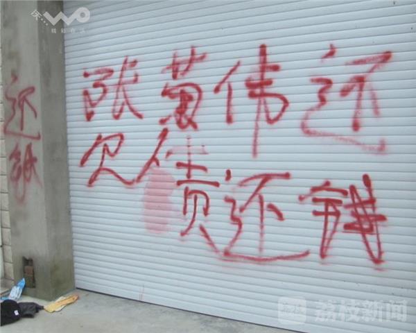 据主人张文生老人介绍,凌晨两点多,他们正在家里睡觉,突然听到“咣当”的几声响,把他们一家人都惊醒了。起床一看,发现二楼窗户玻璃被人用石头砸坏了,他赶紧和儿子一起下楼,看看是怎么回事?紧接着打开门出去,看到几个人影跑到马路边,坐上一辆小车跑了。等他们回头查看时,这才发现自家的大门上、墙上、旁边车库的门上,都被人涂抹上了血红色的油漆,全是“欠债还钱”等字样。