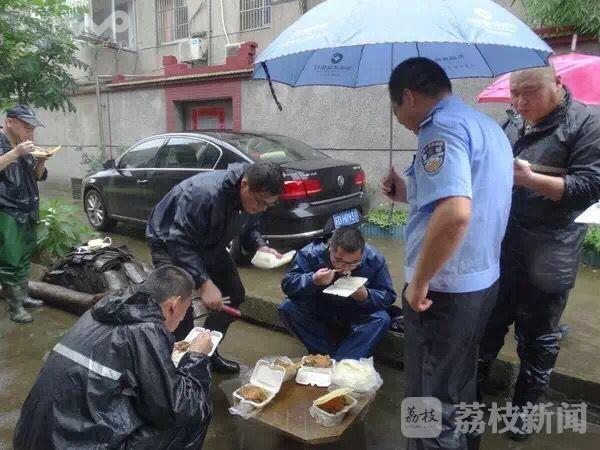 处理完自己辖区的事,钱臻想着自己家新乐村也汛情严重,得赶紧赶过去帮忙。此时新乐二村最深处水深达1m,钱臻把伞一扔,跟巡特警们一起甩起膀子干了起来,铲沙下车、灌沙入袋、扛移沙包、堆筑水堤,各个都是体力活,钱臻总是抢在前头,挑重活干。一张没睡好、胡子拉擦的沧桑脸,配上泥水妆,被同伙笑称为“花脸包公”。来来回回不知路过家门多少次,也没空进去一下,身上衣服全湿了,也不回家换一下。过了饭点,快餐姗姗来迟,却还没来全,钱臻饿着肚子,却让同伙先吃,并在大家吃饭时默默的为大伙儿撑起了雨伞。
