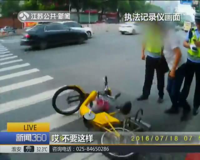 最近,南京交警正在整治非机动车的各项违法行为。前天早上,南京交警六大队民警查处了一位违法带人,还在快车道上行驶的骑车人李某,听说自己的违法行为总计要被罚70元之后,李某先是跟交警讨价还价,之后因为价没还成,竟然激动得把车给砸了。