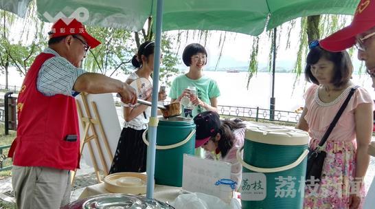 位于西湖景区的柳浪闻莺志愿者“微笑亭”,只见66岁的志愿者裘云根边用长柄勺将茶水从不锈钢大桶中舀进带水龙头的小桶中,边招呼路过的游客,“这个水不烫的,塑料瓶也可以装。”志愿者施志平告诉记者,这是西湖景区连续第5年开展免费凉茶服务。从7到10月,“微笑亭”每天上午10点到下午4点为游客提供龙井茶和温开水。根据天气和客流量的情况,每天至少5大桶,最多的时候14桶,每个桶能装六七十斤水。