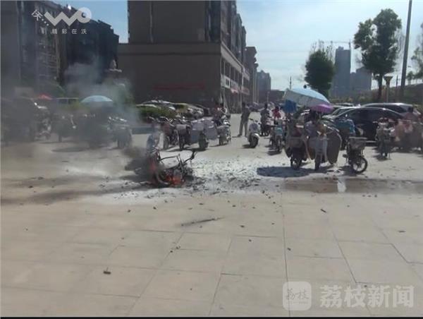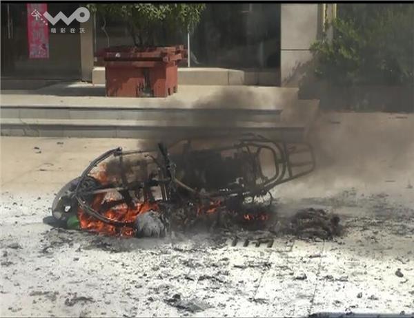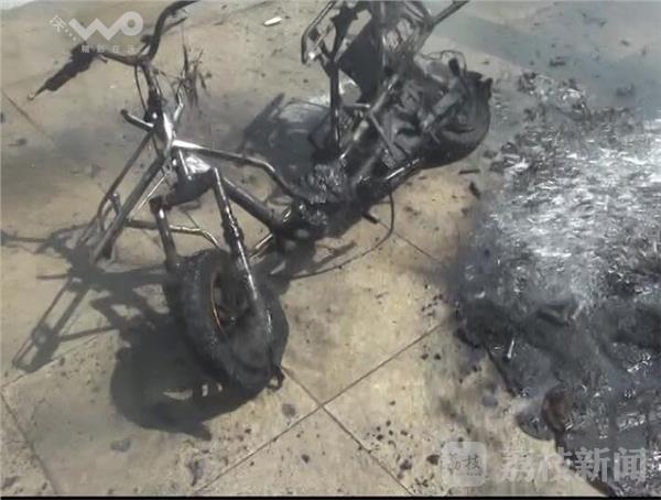 据目击者介绍,事发时,这辆电动车突然发出一声炸响,然后就起起火了,虽然消防人员5分钟后赶到现场及时扑救,然而这辆电动车还是被烧成空壳。