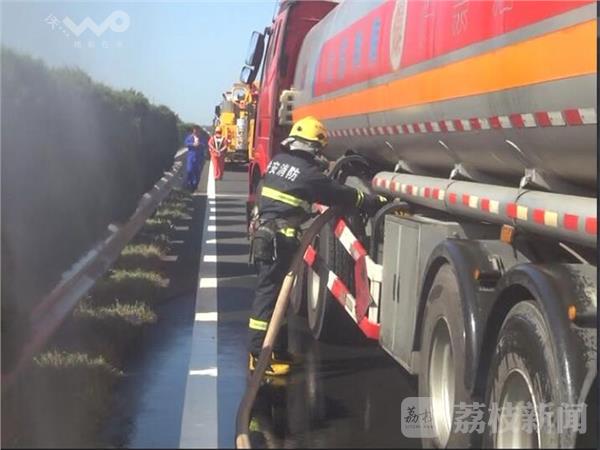 昨天(27号)下午3点多钟,在长深高速淮安市涟水县高沟镇境内,一辆满载25吨汽油的油罐车在行驶时突然与前方一辆小货车发生追尾,导致油罐车罐体损坏,大量汽油喷洒在路面上,情况十分危急。涟水县消防中队接到报警后立即赶往现场进行处置。