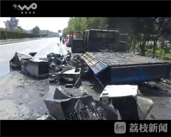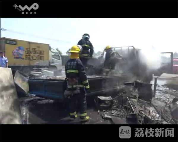 在火灾事故现场,交警部门已经将道路封闭,而一旁起火的车厢内的货物已经散落一地。根据现场情况,消防队员随即利用水枪对火势进行了控制,并将货车内的货物进行转移。最终,经过近20分钟的处置,火势被控制,但是整车货物基本被烧毁,大火还蔓延至整个货车,将货车烧成了空壳。