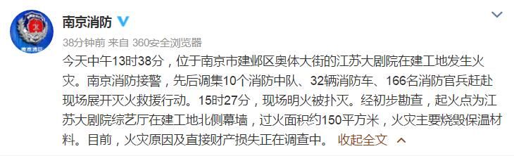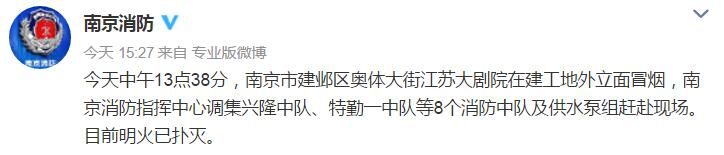 最新消息:经初步勘查,起火点为江苏大剧院综艺厅在建工地北侧幕墙,过火面积约150平方米,火灾主要烧毁保温材料。目前,火灾原因及直接财产损失正在调查中。现场明火在15时27分被扑灭。