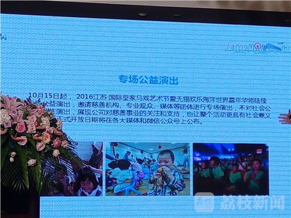 2016江苏·国际皇家马戏艺术节暨无锡欢乐海洋世界嘉年华10月15号在无锡锡北镇开幕。在为期8个多月的时间里,来自10个国家近百位马戏精英,将联手打造一台江苏地区规模最大、持续时间最长的国际级皇家马戏艺术盛宴。艺术节推出多场免费公益演出,邀请福利院儿童老人等共度欢乐时光。2016江苏·国际皇家马戏艺术节由无锡欢乐海洋世界主办,而这也标志着无锡乡村大型旅游专题项目无锡欢乐海洋世界正式启动落户无锡锡北镇。