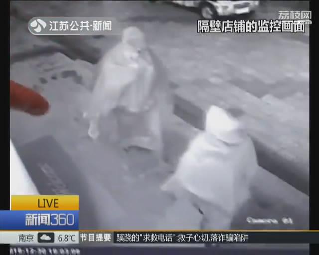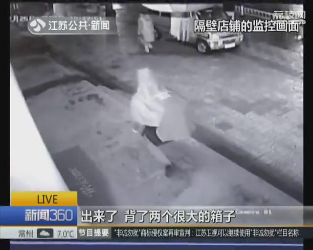 从隔壁店铺的监控能看到,当晚下着雨,19点35分,两名穿着雨衣,蒙着脸的人出现了。19点47分,两人又背着大大的箱子出现在监控中,从动作来看,这时,箱子里的东西重量应该不轻。