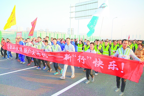 12月30日,高架建设者们拉着红色横幅,祝愿市民新“行”快乐。