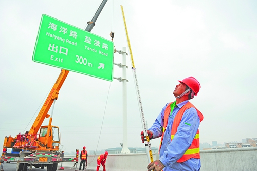 11月7日,测量工张晓修对正在安装的标志牌进行净空高度测量。