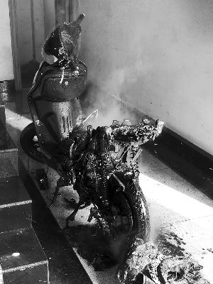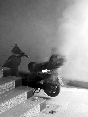从产生电火花之后的短短4分20秒,由于电动车材质大部分使用的是易燃的塑料,同时使用者经常会在车座垫下放雨披、手套乃至废纸等易燃物,加上电池内有液体等,车辆很快就会加剧燃烧起来。出于现场安全的考虑,守候在一旁的消防员迅速出水将明火扑灭。记者发现,燃烧的电动车后半部已经被烧得只剩下框架。