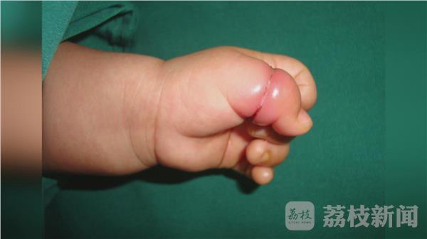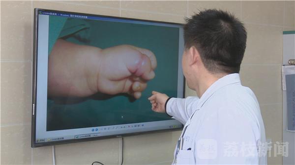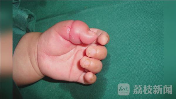 随后,王女士抱着女儿来到仁慈医院治疗。徐州仁慈医院手足显微外科主治医师胡俊生表示:“当时我们接诊的医生过来一看,左手拇指的在掌指关节有一个细小勒伤的痕迹,而且非常明显,一直到达深部组织,手指头血液也不太好,已经发肿、发青、发紫了。说明这个手指过血很差。”