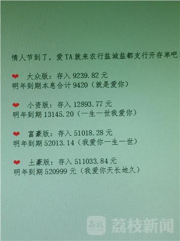 今天(2月14日)是情人节,不少人以不同的方式向心爱的人表达爱意。上午,盐城市的王先生兴冲冲地来到银行,开出了一张金额为51018.28元的特殊存单:一年后连本带息共可收获52013.14元。他说,他要把这张存单作为情人节礼物送给他的妻子:“我爱你”“一生一世”!