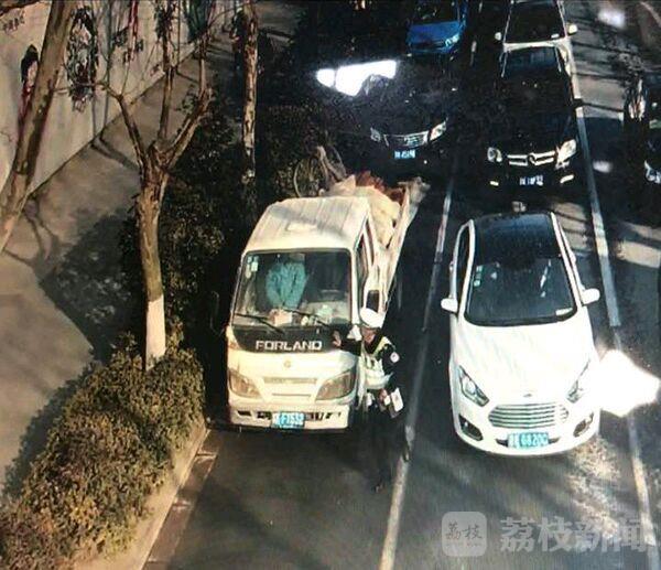 今天(3月8日)上午8点10分左右,扬州交警在京华大酒店的京华岗查获了一辆违法闯禁区的小货车。