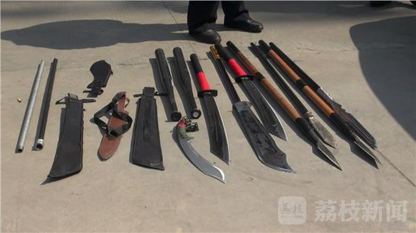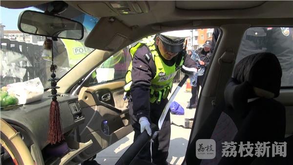 民警一边悄悄的通过警务通查询到驾驶员信息和联系方式,又立即向大队领导汇报该车携带管制刀具的警情,副大队长申爱国立即增加警力布控现场。随后民警以违停为由通知了驾驶员,并以该车有违章为由让驾驶员把车开离闹市区到安全区域,然后民警突然合围,控制住驾驶员。经现场清点,有大刀4把、短刀2把、红樱枪2支、长矛2支、棒球棍两根、铁管两根。据驾驶员交代,他是大丰区人,姓管,和他一起住在宾馆的还有一位姓蒋的同伴。随后副大队长申爱国安排警力赶赴宾馆将蒋某控制。管某交代车上的管制刀具为非法购买,对自己违法犯罪事实供认不讳。管某蒋某和查获的管制物品一起移交大丰区城南派出所。目前,案件还在深挖之中。