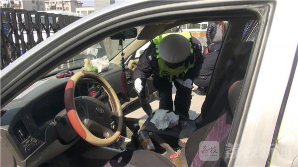 3月8日11点左右,大丰区交警大队民警贺军带领辅警正在市区正常巡逻,当巡逻到黄海西路时发现有一辆银色轿车违停在某宾饭门前路段,发现一辆银色轿车停放在非机动车道内影响通行,民警贺军检查发现驾驶员在现场,民警通过窗户向车内观察发现后座上有一只大包,一开始民警还以为是一位钓鱼爱好者,就在准备通过警务通查询通知该车驾驶员,这时民警突然发现包内有砍刀。
