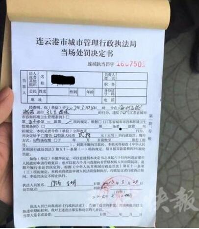 现代快报讯(记者 王晓宇 通讯员 朱晓洁)3月24日上午,连云港市海州区城管一大队执法人员对一名在路边随意倾倒果皮的经营户给予罚款20元的行政处罚。据悉,这是该市创建全国文明城市动员大会以后,城管执法人员依法对随地乱扔垃圾等不文明行为开出的首张罚单。