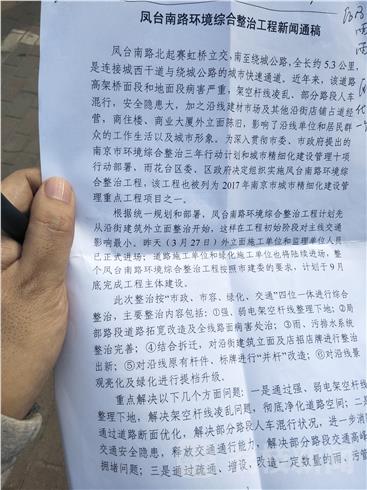 在凤台南路环境综合整治工程中将严格按照“民主整治”的要求,充分听取沿线居民意见,目前已经走访发放近60份市民意愿调查表。