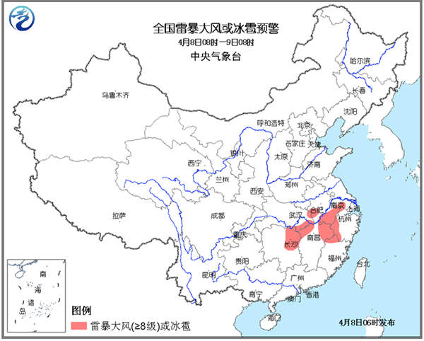 预计4月8日08时至9日08时,湖北东南部、湖南东北部、安徽南部、江苏西南部、江西北部、浙江西部、福建西北部等地的局部地区将有8~10级雷暴大风或冰雹天气;四川东部、重庆北部、湖北东部、湖南东北部、安徽南部、江西北部、浙江西部、福建北部等地的部分地区将有短时强降水,小时雨强20~40毫米,局地可达40~60毫米;强对流最强时段在8日中午至9日凌晨。