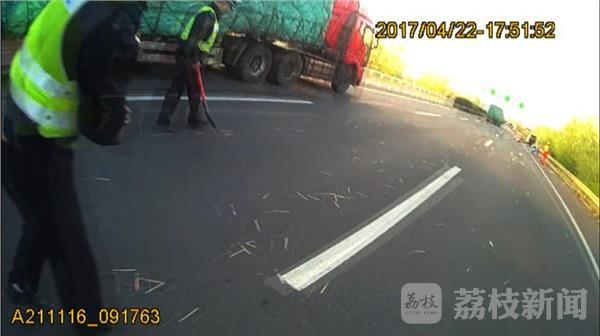 4月22日傍晚5点多钟,刚刚端起饭碗的沈海高速盐城高速交警二大队交警卞桅国指导员接到110指令,在沈海高速射阳县兴桥出口向北到响水出口,多处路面出现铁钉,已经导致有多辆在该路段通行车辆的轮胎被戳破爆胎,请立即上路排除险情,确保道路通行安全。