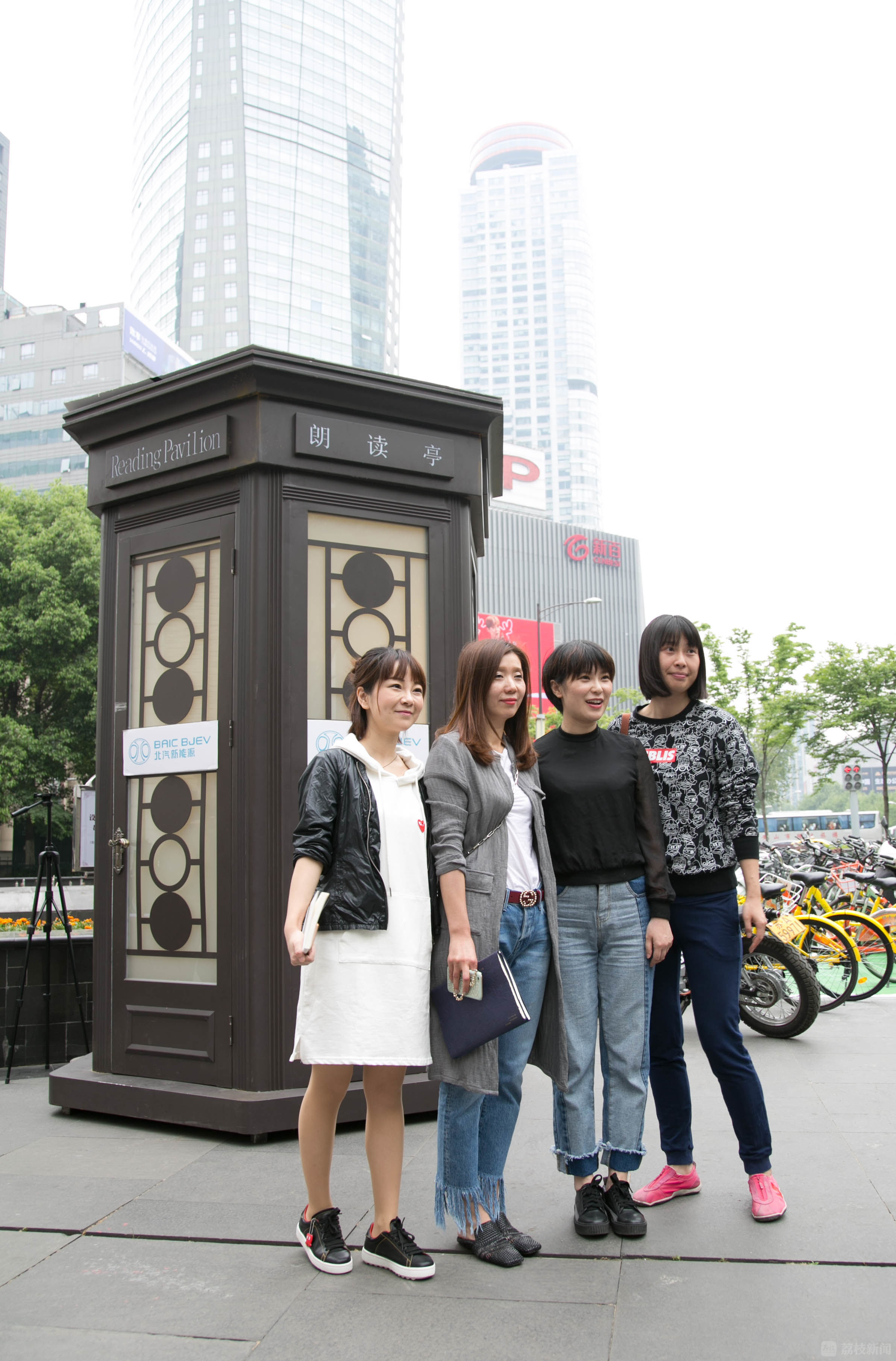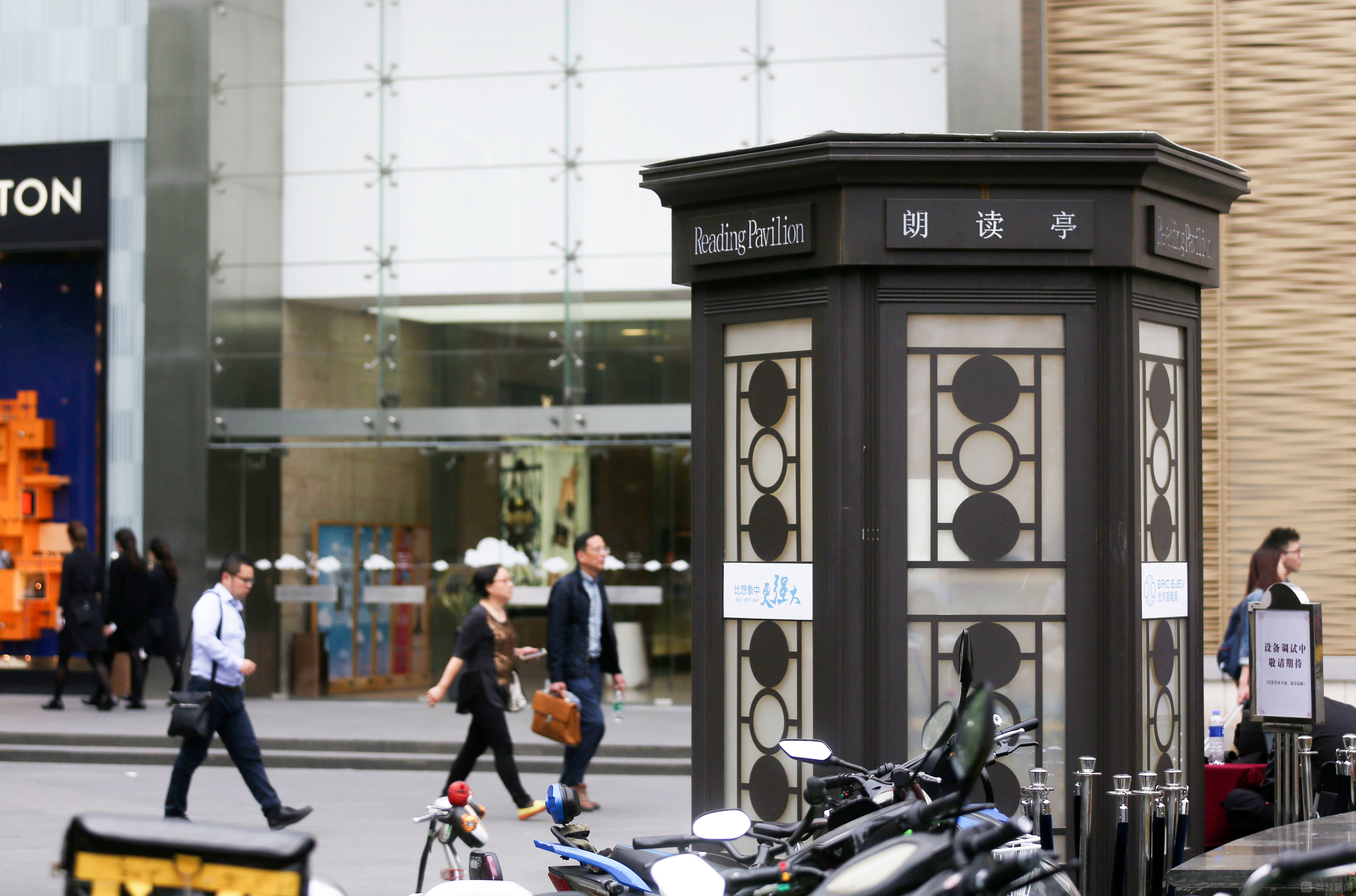 在新街口德基广场户外,荔枝新闻记者看到了这座稍显古朴的“朗读亭”。亭子高约3米,占地面积约3-4平方米。外观古朴别致,上面写着大大的“朗读亭”字样。内部有两个GO PRO摄像机以及一套完整的专业录音设备。亭内没有凳子,朗读者只能站着进行朗读。在现场,不少市民站在“网红”朗读亭前拍照留念,也有不少市民拿着书前去尝鲜朗读。