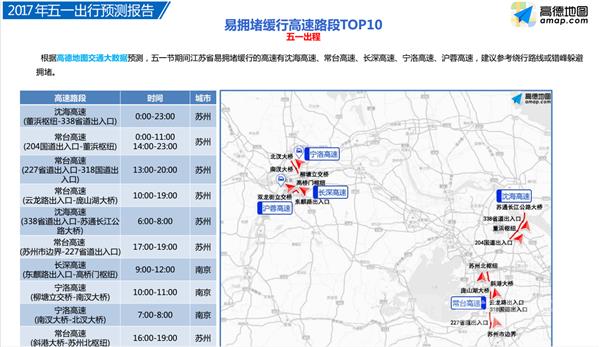 五一全国高速继续免费通行,预计从4月28日下午2点开始,拥堵逐渐上涨,但整体拥堵趋势较清明假期略为平缓。1号将是五一小长假最堵的一天,并在下午4点到5点达到最高峰。出程时段易拥堵缓行高速主要集中在苏州市、南京市等:高速路段为:沈海高速、常台高速、长深高速、宁洛高速、沪蓉高速、京沪高速;五一返程时段易拥堵缓行高速主要集中在苏州市、南京市、无锡市、常州市、镇江市等,高速路段为常台高速、常合高速、沪蓉高速、京沪高速、长深高速、宁洛高速、沪直高速等。