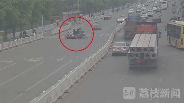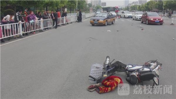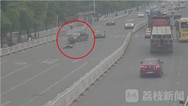 这是4月26号下午2点,发生在徐州鼓楼区二环北路与煤港路附近,一辆电动车在过人行横道时,由于被过往车辆挡住视线,且速度过快,被对面车道的一辆出租车撞倒,驾驶员被撞腾空飞起。