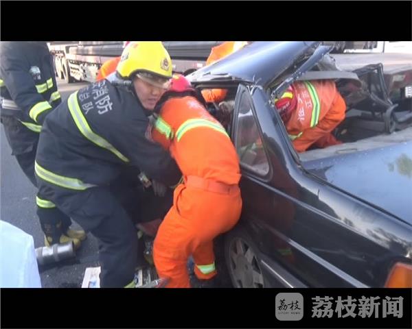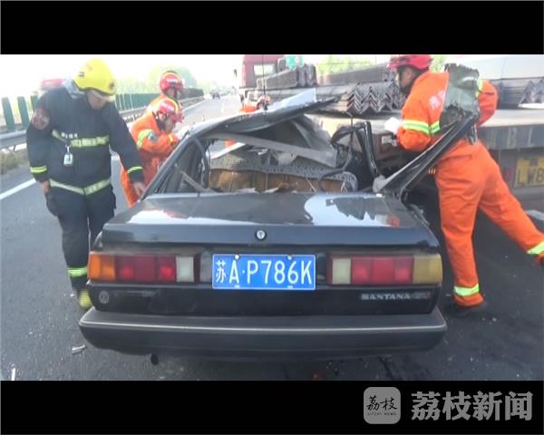 当荔枝新闻记者赶到事故现场后,发现一辆轿车与满载钢材的货车追尾,轿车车头严重变形,整个副驾驶被插进货车车厢尾部,被困司机因两车追尾时产生的巨大冲击力,已经从驾驶座位上被挤压到后排座上,口中不停地吐着鲜血。经过现场消防队员检查,发现被困司机在后排座上没有被卡住,但司机因伤势太重,无法自行下车。随即,消防队员从轿车的不同方位钻进车内,在医生的指导下小心翼翼的将司机抱出车外,避免其二次伤害。随后,被困司机被紧急送往医院救治。