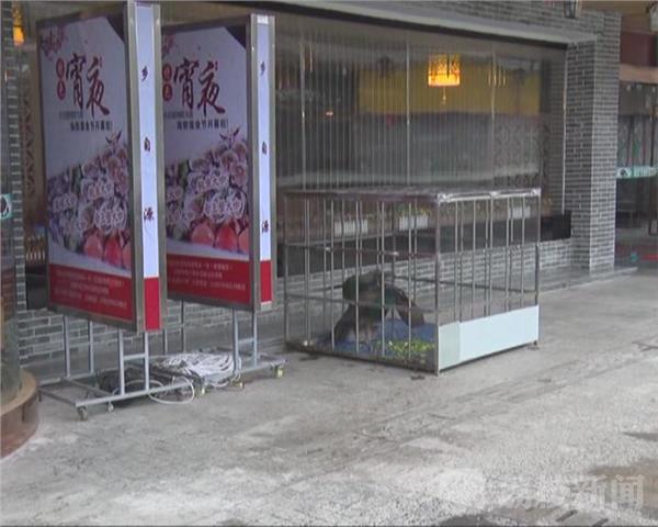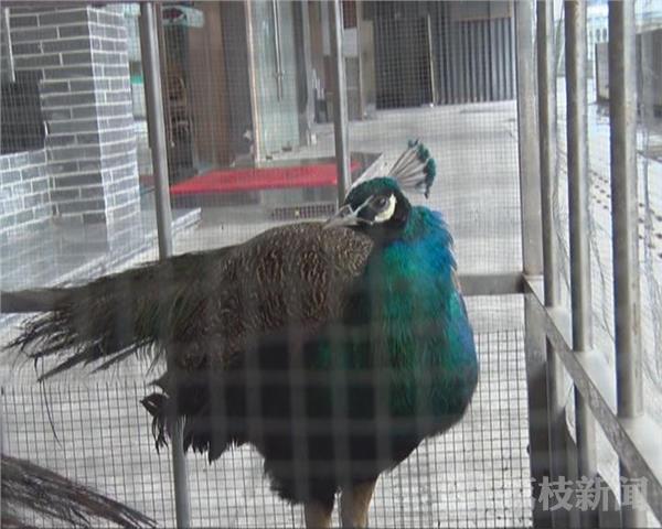 在这家烤鸭店门口,有一个大铁笼子,笼子里关着两只孔雀和一只小型禽鸟类动物,笼子里还撒了食物,尽管不愁吃喝,但两只孔雀看起来精神不振。店老板陈先生说,孔雀是朋友送来的,养殖许可证正在办理,如果办不下来,就把它们送回去。放在门口目的就是为了吸引顾客,并不是用来宰杀食用的。