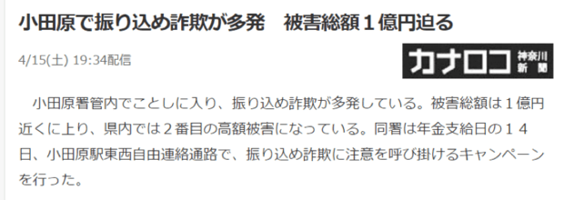 (2017年4月,日本神奈川县小田原市多次发生电信诈骗,被骗金额多达1亿日元)