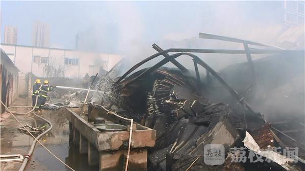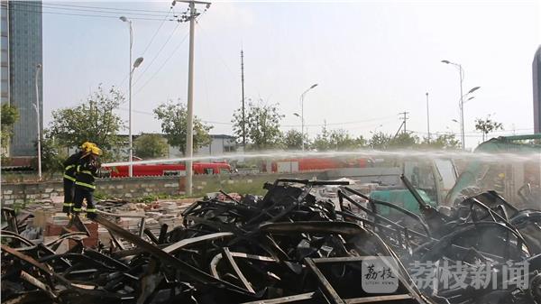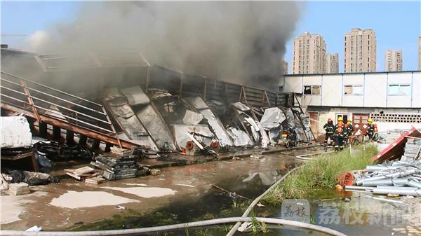 消防员到场后询问报警人得知:着火物为2层活动板房,1层为仓库,2层为办公、宿舍。此时板房已经被大火烧塌。消防员迅速展开扑救,1号车出两支水枪分别从起火板房的南侧、西侧进行堵截灭火,西侧水枪延伸到起火板房的北侧进行堵截灭火,随后再出一支水枪占据起火板房西侧位置打压火势进行灭火。经过大约40分钟明火被扑灭,由于是两层活动板房倒塌,倒塌后底部还在燃烧,随后调用挖机将其倒塌的板房一点一点的挖开,消防员出一支水枪进行配合灭火,最终将其彻底熄灭。经询问负责人得知,工友打电话给他说起火了,自己赶到时已经烧起来了,目前火灾具体原因还在调查中。