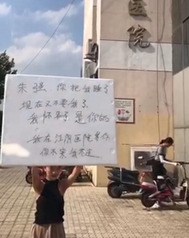 记者发现,一身着卡其色阔腿裤配黑色 T 恤的年轻女子,手举白色板牌,上面清晰可见:" 朱强,你把我睡了,现在又不要我了,我怀孕了是你的,我在江阴医院等你,你不来我不走。"