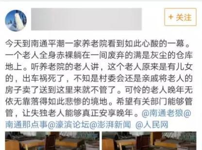 8月26日,一位网友称,“一名老人全身赤裸躺在一间废弃的满是灰尘的仓库地上。听养老院的老人讲,这个老人原来是有儿女的,出车祸死了,不知是村委会还是亲戚将老人的房子卖了,送到这里来就不管了。希望有关部门能够管管,让失独老人能够真正安享晚年。”消息发出后,已有97人转载,评论也达到了149条。从微博的配图中我们发现,倒在地上的老人是一名满头银发的女性,赤身裸体,侧身压着一块棕色的垫子,旁边放着一辆轮椅车,所处环境十分脏乱。然而,正当网上质疑声一片时,却有人称事实并非如此。