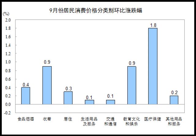 9月份,其他七大类价格环比均有不同程度的上涨。其中,医疗保健、居住、交通和通信价格分别上涨1.8%、0.3%和0.1%,其他用品和服务、生活用品及服务价格分别上涨0.2%和0.1%;衣着、教育文化和娱乐价格均上涨0.9%。