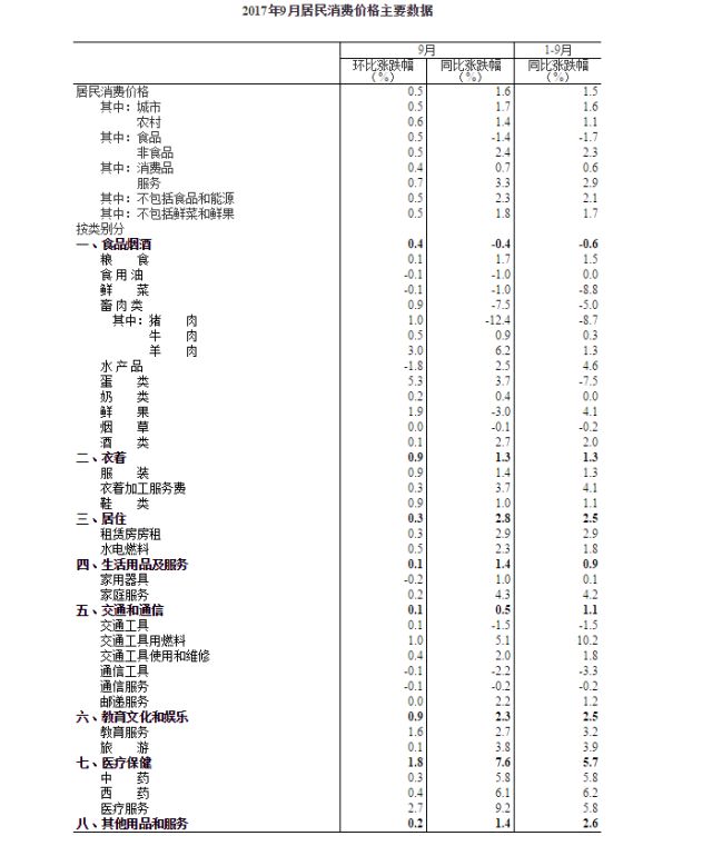 2017年9月份,全国居民消费价格同比上涨1.6%。其中,城市上涨1.7%,农村上涨1.4%;食品价格下降1.4%,非食品价格上涨2.4%;消费品价格上涨0.7%,服务价格上涨3.3%。1-9月平均,全国居民消费价格总水平比去年同期上涨1.5%。