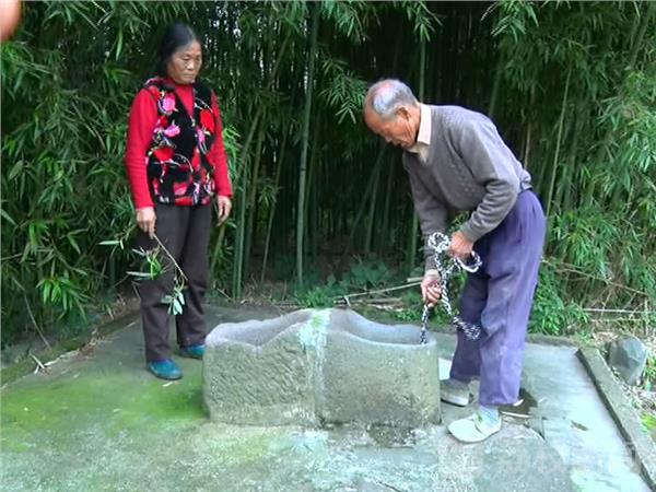 这口双眼井的主人吴老汉今年70多岁了,老人告诉记者,我们村有50多户,200多村民,60年前,不但本村人天天都来这里从井边淘米洗菜洗衣,就连周边3个村庄的500多户老百姓也都来这里挑水回去吃,那个场面,可热闹了。小时候听老人说,这口井建成后,在井口排队提水的人太多,排起了长队,有时几个提桶同时放下井口,桶与桶还将井口堵住,为了提水不相缠,节约时间,村里老人想出了个注意,就是在井口装上双井栏,有了双眼井后,每天打水排队的人明显少了,打水的秩序也好多了。如今虽然家家用上了自来水,各家各户为了方便也打起了井,老井也渐渐开始落寞,他现在是唯一还吃这口双眼井水的人。