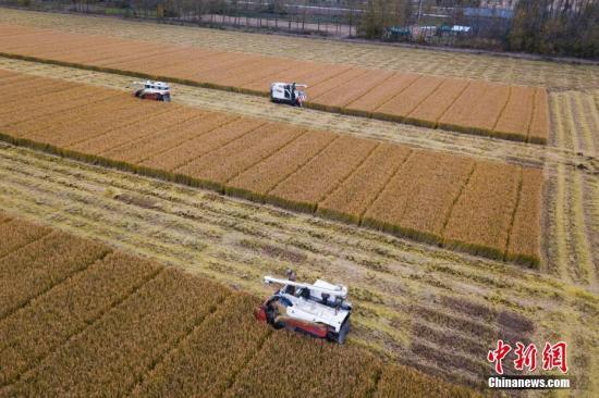11月12日,航拍江苏淮安郊外田间,收割机正在来回移动收割水稻。中新社记者 泱波 摄