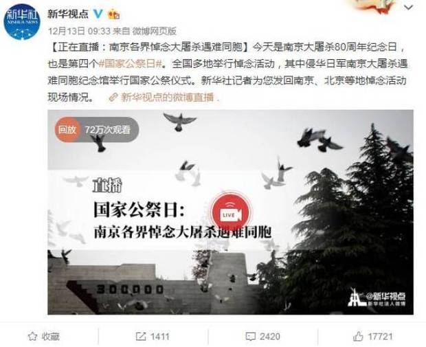 13日9:33,新华视点微博开始直播南京悼念活动现场情况,这场直播持续了1小时11分钟。七十多万网友观看了直播。