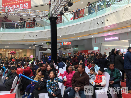 数百人顶着南京少有的零下的低温聚集到万达广场中庭参加“荔枝新闻王”超级轰趴,有白发苍苍的古稀老人,有萌哒哒的襁褓婴孩,还有汪星人也来凑热闹。我们的主角——更漂酿的人偶小荔枝和更聪明的机器人小荔枝一到现场就成了团宠,小盆友们纷纷围着他们合影、聊天。