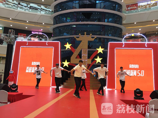 昨天活动的开场一曲劲歌热舞迅速将周围逛街的人群吸引过来了~穿着T恤的小鲜肉们+荔枝新闻首款定制主题曲瞬间点燃了全场。