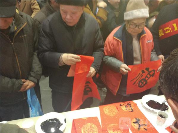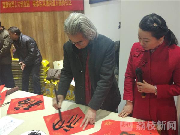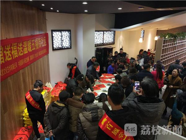 活动现场,南京百凤堂艺术馆、南京东南书画院邀请中国书法家协会员徐澄、陆亚鸿、初湘义、刘长平、王建强、孙玉杰等6位书法家,现场为双塘街道五福街社区50户特困户、军属贫困户写“福”、写春联。爱心企业特地为50户特困户、军属贫困户釆购了大米与食用油。